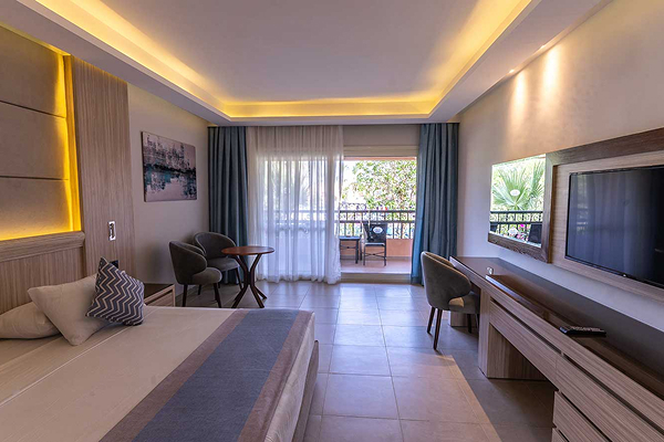 • Deluxe Sea Side View Room (33-35 м², макс. 2 взрослых + ребёнка, балкон/терраса) — частичный вид на море.