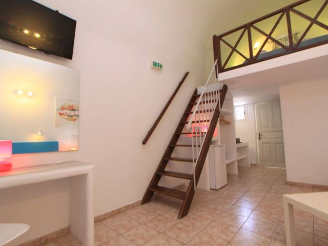 Maisonette Side Sea View: на нижнем уровне – гостиная зона, 2 встроенных дивана; на верхнем уровне – двуспальная кровать; максимальное размещение 3 взр. и 1 ребенок или 4 взр.
