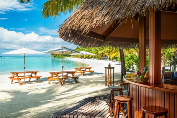 Уютные номера, коттеджи и виллы расположились под раскидистыми пальмами на белоснежном песчаном берегу и над прозрачными водами лагуны, окружающей остров.