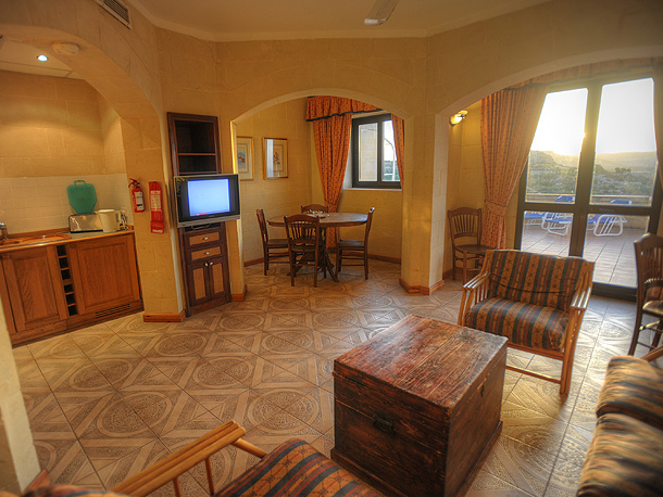Junior Suite: ванная комната с джакузи, фен, кондиционер, гостиная, телефон, кабельное ТВ, набор для приготовления чая/ кофе, мини-бар (не во всех номерах); двойной балкон с панорамным видом на море и с видом на Цитадель в Виктории на другой стороне