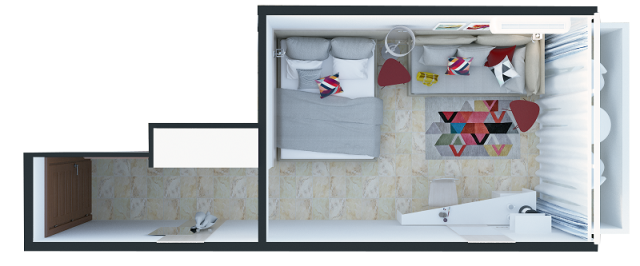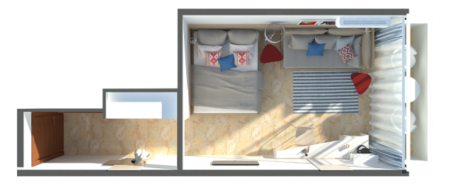 ванная комната, халат/ тапочки (по запросу), фен (только в A 1 bedroom), две односпальные или одна двуспальная кровать, раскладной диван, кондиционер, ТВ, телефон, мини-бар, сейф (€), Wi-Fi и проводной интернет (не во всех номерах), балкон