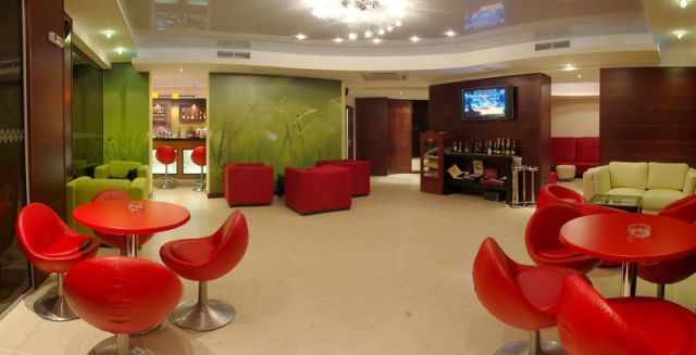 214 номеров; открытый бассейн (шезлонги и зонтики), сейф на ресепшн (€), Интернет-клуб (€), Wi-Fi в лобби, магазины, обмен валюты, парковка, услуги прачечной (€)