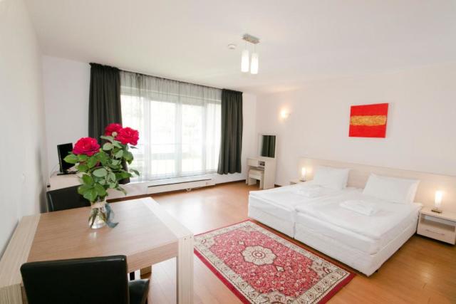 150 номеров; закрытый бассейн, переход между зданиями, SPA-центр (€), сейф на ресепшн, Wi-Fi, Room Service, Интернет-уголок (€), обмен валюты, оплата кредитными картами, парковка, гараж, камера хранения горнолыжного снаряжения, транспорт до подъемника