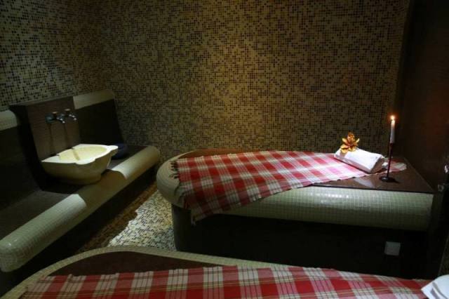 джакузи (€), турецкая баня (€), паровая баня, сауна, массаж (€), комната отдыха, косметические процедуры (€)