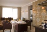 Apartment: гостиная и спальня, разделенные дверью, в гостиной раздвижной диван, оборудованный кухонный уголок (посуда и столовые приборы, электрочайник, электропечь, духовка, вытяжка, микроволновая печь), столовая зона