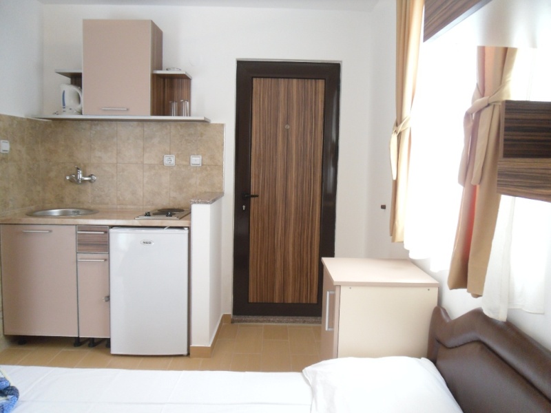В апартаментах/студиях: ванная комната с душем, кухонный уголок для приготовления легкой пищи, электрический чайник, кондиционер, фен , ТВ (8 русских каналов), терраса со столом и стульями, пол - керамическая плитка