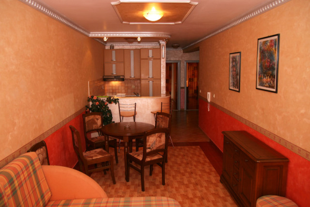 ванная с душевой кабиной, пол – керамическая плитка, в спальнях – ламинат, все комнаты разделены дверьми, кухонный уголок, кабельное ТВ (4 российских канала), Интернет, wi-fi, фен, сейф, кондиционер, утюг с гладильной доской, электрический чайник
