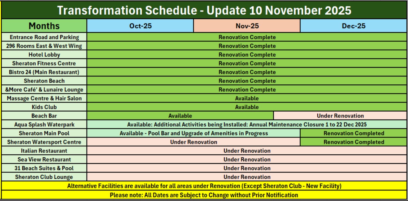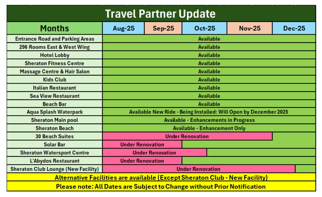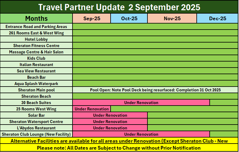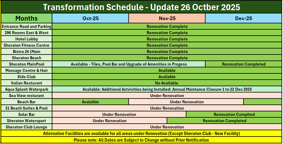 12.09.2024. В отеле подходит к завершению часть ремонтных работ: 142 номера будет готово к приему гостей с 01 октября 2024 г., фитнес-центр откроется к середине октября 2024 г. Следующая часть ремонтных работ будет проводиться в номерах восточного крыла, зоне ресепшн, баре Solar и главных ресторанах с 15 сентября 2024 г. (9:00 — 17:00). В период проведения работ для удобства гостей будут доступны следующие временные альтернативы: вестибюль, стойка регистрации, Porte Cohere — временно перенесены в конференц-центр для удобства регистрация заезда; зона бассейна и бар — оборудован дополнительный бассейн со всеми удобствами; главный ресторан — перенесен в изысканный итальянский ресторан и ресторан с видом на море; бар Solar — перенесен в Royal Suite (Королевский люкс). Пляжная зона (800 м) и Аквапарк будут работать в обычном режиме.