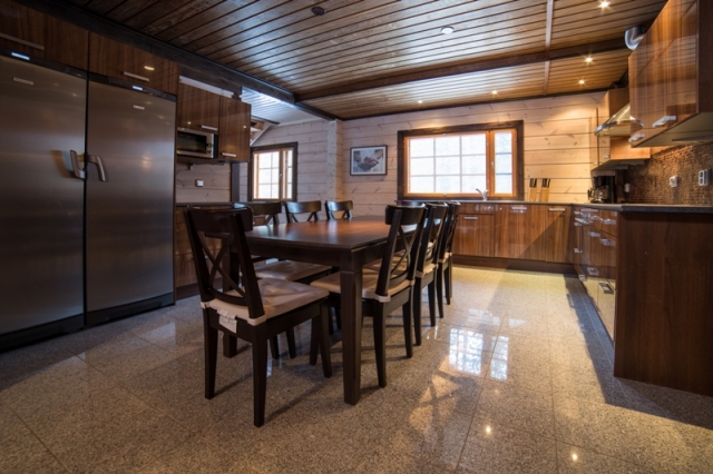 на первом этаже: кухня, гостиная (ТВ/DVD/ Karaoke), камин, 2 спальни, душевая, туалет, ванная комната, сауна (выход на террасу). На втором этаже: 2 спальни с выходом на балкон, ТВ, туалет, умывальник, стиральная машина. Кухня оборудована современным бытовым оборудованием, посуда, плита, духовой шкаф, холодильник, посудомоечная машина, микроволновая печь, кофеварка, чайник, тостер, стиральная машина, сушильный шкаф, утюг и гладильная доска, розетка для обогрева автомобиля, дрова для камина. Wi-Fi (бесплатно); максимальное размещение 8 взр. + 1 доп. место