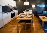 апартаменты с 1 спальней (без камина), балкон, гостиная с кухонной и обеденной зоной, спальня с 2 раздельными кроватями, альков с 2-х ярусной кроватью, сауна, ванная комната, DVD, ЖК ТВ, полностью оборудованная кухня: чайник, кофеварка, холодильник, микроволновая печь, посудомоечная машина, столовые принадлежности, стиральная машина, сушильный шкаф, Wi-Fii; максимальное размещение 4 взр.