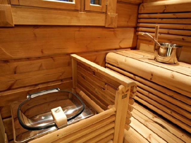 На первом этаже: гостиная с мини-кухней, спальня (2 односпальные кровати), сауна, душ, туалет; при входе, на террасе – комната для хранения лыжного оборудования и др. спортивного инвентаря