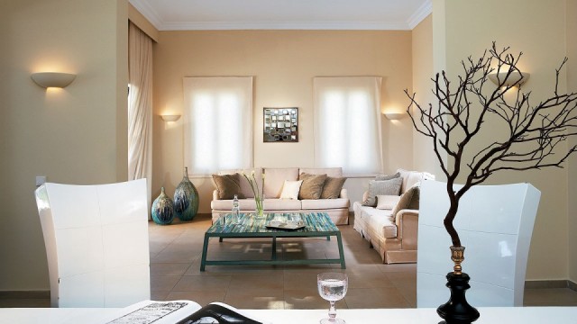 Villa Delos Private Pool (105 м2): 2 спальни, гостиная, 2 двуспальных и 2 односпальных кровати, 2 ванные комнаты, вид на море, бассейн 32 м2. Максимальное размещение – 4 взр. и 2 реб.