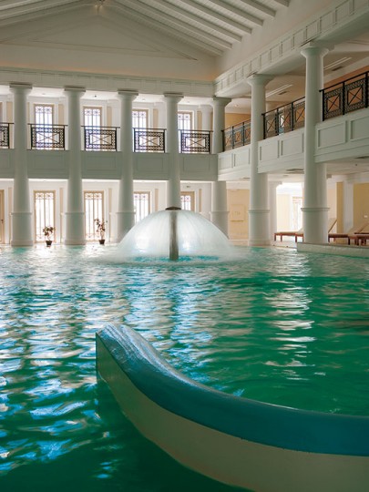 на площади 4500 м2: талассотерапевтический бассейн Aqua Elixir с коридором «бурная река», водными пушками, гидромассажными сидениями, струйным массажем и гидромассажным душем. Бассейн с прохладной водой для погружения, крытый плавательный бассейн с подогревом. Два гидромассажных бассейна на свежем воздухе под навесом в стиле храмовой постройки и один крытый гидромассажный бассейн. Сауны и парильни. Крытая галерея для релаксации, где можно отдохнуть между процедурами. Тренажерный зал с ультрасовременными кардиотренажерами Star Trac, залы для индивидуальных тренировок. Отдельные мужские и женские раздевалки с индивидуальными запирающимися шкафчиками, соковый бар