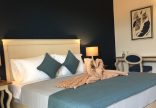 Double Qeen Deluxe ( 27 м2) – однокомнатный номер с боковым видом на море или на сад. В номере есть сейф, набор для приготовления чая и кофе, халаты и тапочки