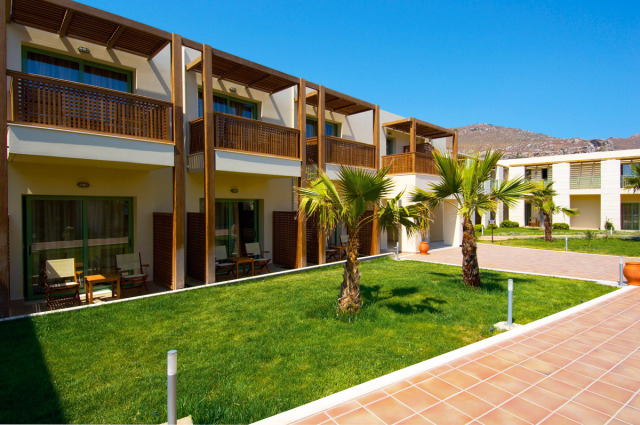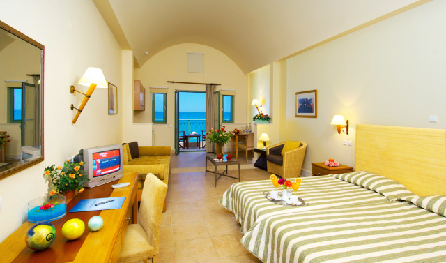 Junior Suite Sea Front (35 м2): номера с открытой планировкой и двумя односпальными кроватями сдвинутыми вместе, небольшим мягким уголком с диваном, ванной комнатой с ванной, а также обставленным балконом, откуда открывается вид на море. Эти номера расположены на последнем этаже; максимальное размещение 3 взр.