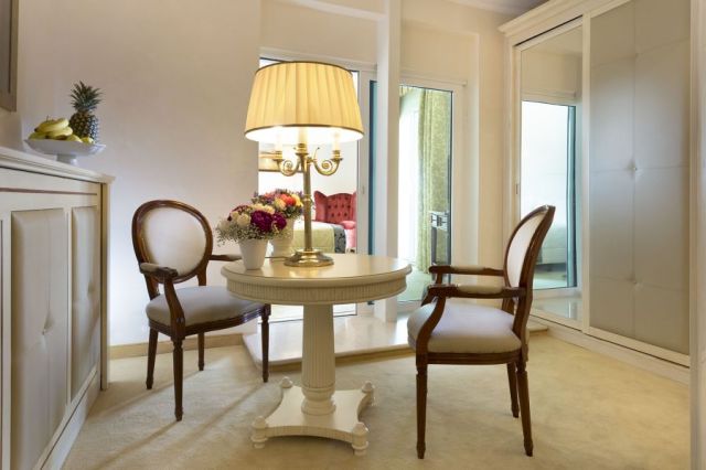 ванная комната с душевой кабиной или ванной, фен, кондиционер, телефон, ТВ, сейф, мини-бар (€), кофемашина (кроме номеров Classic и Superior), балкон, джакуззи (в типе номера Suite)