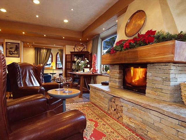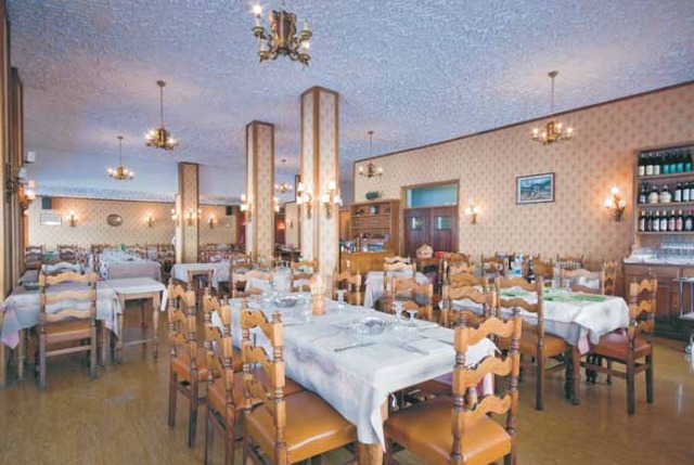 ресторан разделен на три зала, имеет интернациональную и традиционную альпийскую кухни, бар с камином