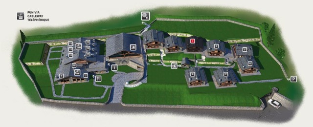 16 шале; ресепшен, услуги прачечной (€), Интернет, камера хранения для лыж, библиотека, сейф на стойке регистрации, дрова для камина (€), уборка кухни (€), общий гараж (€), частный гараж(€)