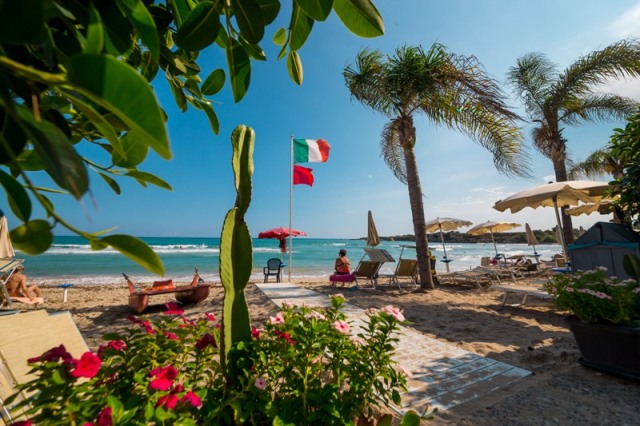 частный, песчаный; пляжный сервис (зонт и 2 лежака на номер) на 2-й линии – бесплатно; 1-я линия (€) и пляжные полотенца (10€ на человека/неделя, включая 2 смены + залог 10€/полотенце)