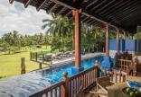3-bedroom family garden villa with pool (590 кв. м): терраса с открытым персональным бассейном (22 м), гостиная с обеденной зоной, кухня, 3 спальни (одна — с кроватью king-size, две — с двумя отдельными кроватями), 3 ванные комнаты (две — с ванной, душевой кабиной и душем на открытом воздухе, третья — с душем). Расположена в южной части курорта. Частичный вид на сад.