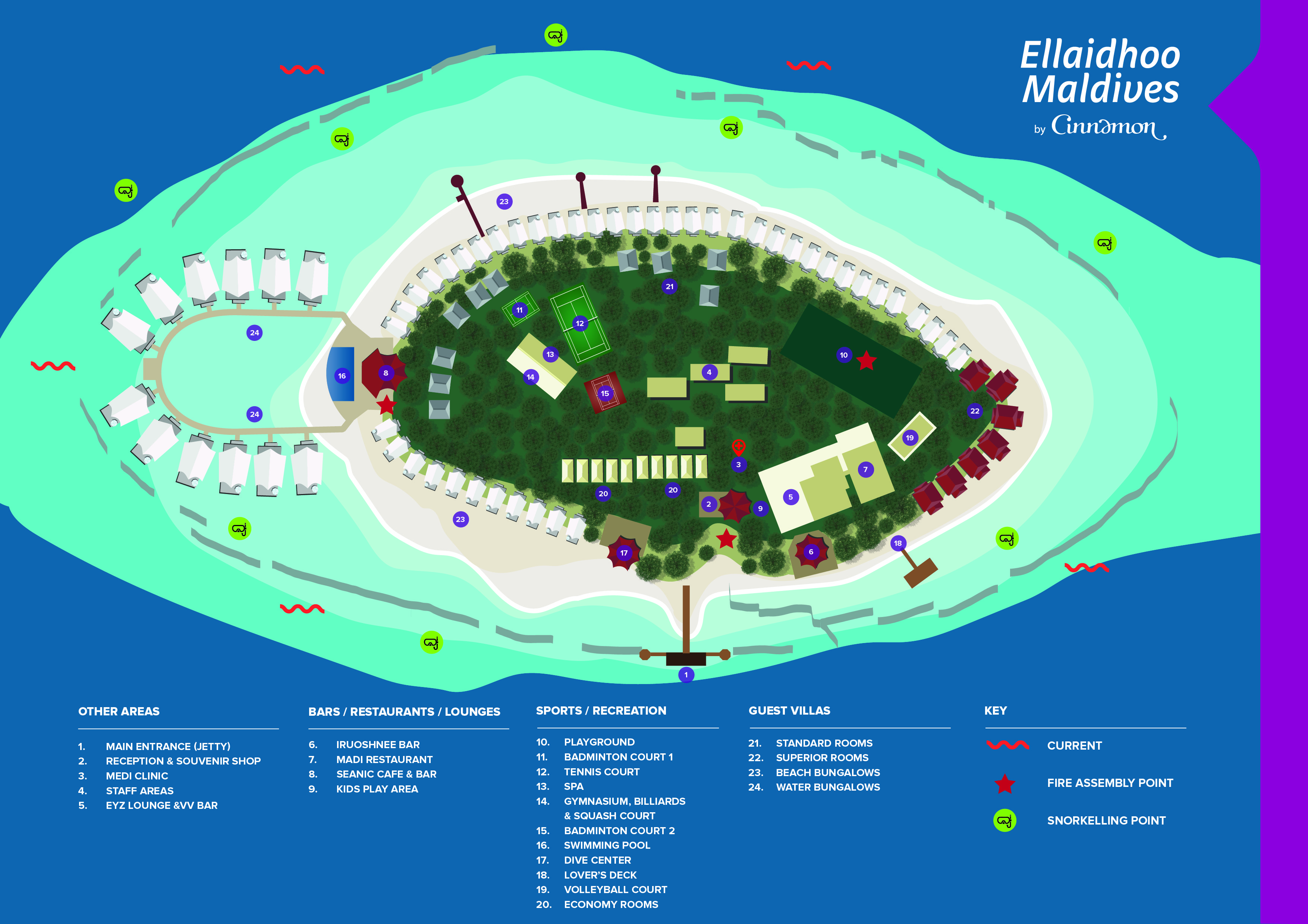 Отель расположен на острове Ellaidhoo Северный Ари Aтолла. Небольшой уютный остров, окруженный великолепным домашним рифом с пещерами. Интересные места и затонувший корабль привлекают в этот отель любителей подводного плавания. На соседнем острове Maagaa находится Центр водных видов спорта (до острова можно добраться на лодке за 10 мин). Отель имеет один из лучших домашних рифов в 20 м от берега.