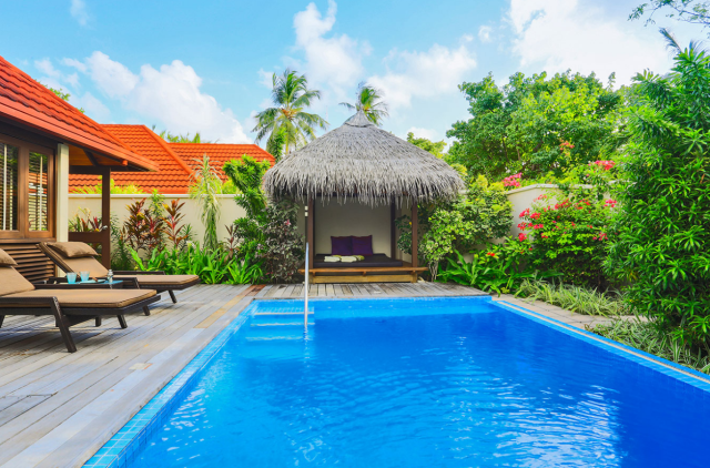 8 Garden Pool Villa (124 м2): отдельно стоящие виллы в саду; терраса с лежаками и собственным бассейном; DVD плеер, завтрак в ресторане Thila; Максимальное размещение - 2 взрослых и 2 детей или 3 взрослых (схема номера)