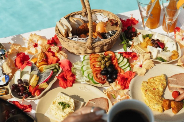 Комплимент от отеля: бутылка игристого вина и корзина с фруктами (для молодоженов); бутылка игристого вина и торт (годовщина свадьбы).