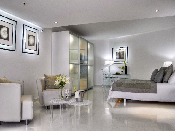 Junior Suite (50 м2): прихожая, обеденный стол, спальня, раскладывающийся диван, рабочий стол, большая терраса с лежаками и зонтами