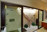 Главная спальня: двуспальная кровать (1,80 х 2 м), просторная ванная комната с душевой кабиной с открытой крышей, двойной умывальник, туалет, кондиционер, потолочный вентилятор, цифровой сейф и гардеробная. Комната выходит на веранду с видом на море.