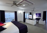 ванная комната с гидромассажной ванной и душевой кабиной, двойная раковина, зеркало для макияжа, фен, телефон, кондиционер, потолочный вентилятор, бесплатный wi-fi, мини-бар, кофеварка, спутниковое ТВ, радио-будильник, сейф, утюг и гладильная доска, балкон/ терраса