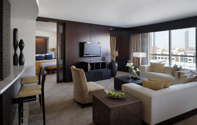 Executive Suite (135 м2): гостиная со столовой зоной, терраса с панорамным видом на центр Дубаи и Старый город, вид на город или фонтан