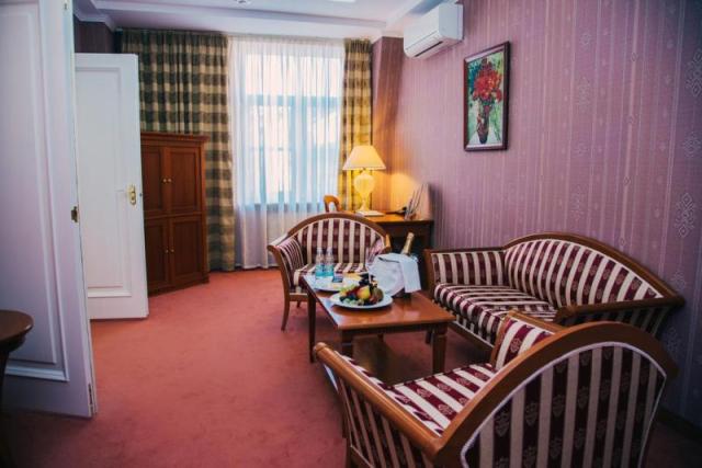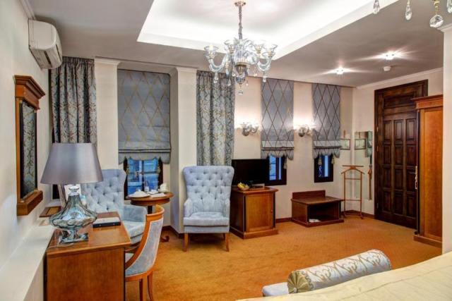 Люкс Классический: 43 м2. Номера с широкой двуспальной кроватью и полутороспальным диваном, номер разделен на 2 зоны (гостиная и спальня). Просторная ванная комната с ванной джакузи и биде. Балкон