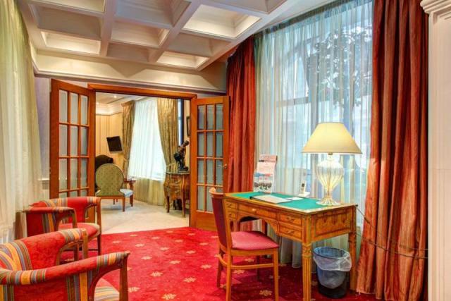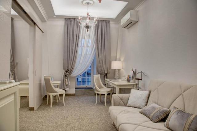 Сюит Голден Гарден: 75 м2. 3-комнатный номер с широкой двуспальной кроватью, 3 панорамных окна с видом на театр им. Ленсовета. Гостиная с итальянской мебелью ручной работы, отдельный кабинет. Просторная ванная комната с ванной и биде