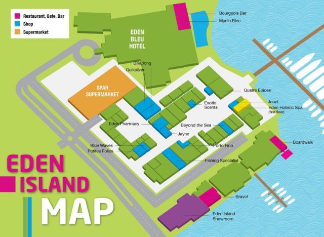 Крупный комплекс вилл и апартаментов располагается на искусственном острове Eden, расположенном на востоке острова Маэ. Остров предлагает обширную туристическую инфраструктуру - магазины, рестораны, кафе, сувенирные лавки и т.п.