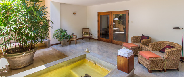 Shanthi Suite: просторный однокомнатный номер, спальня с гостиной зоной, ванная комната открытого плана, веранда с выходом в сад