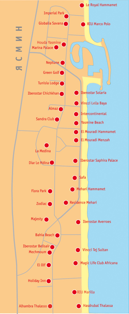 • центры талассотерапии в отелях: Radisson Blu Resort & Thalasso 4*, Aziza Thalasso Golf 4*, Nahrawess 4*, Vincci Lella Baya 4*, Sol Azur 4*, RIU Palace Hammamet Marhaba 5*, Royal Azur 5*, Hasdrubal Thalassa Hammamet 5*, El Mouradi Hammamet 5*, Alhambra Thalasso 5*