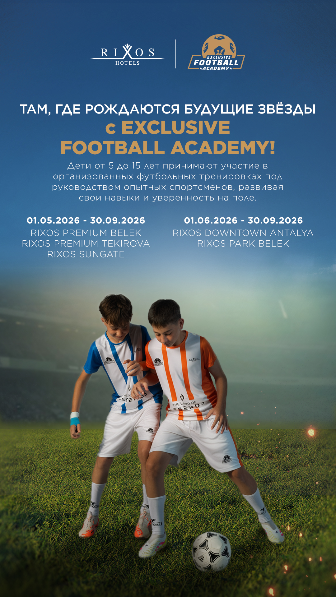23.02.2026. Проект Exclusive Football Academy в Rixos Hotels региона Анталья (афиша). Дети (5 - 15 лет) принимают участие в организованных тренировках под руководством опытных тренеров. Период проведения футбольной академии в отеле: с 01 июня по 30 сентября 2026 г.