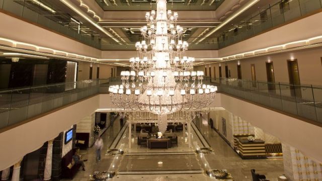 Недавно открытый отель расположен на площади в 53000 м2, его архитектура выполнена в стиле Замка.