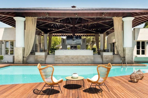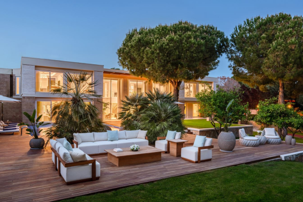 Pryamus Residence (2000 м², макс. 9 человек, 9 комнат, кухня, 2 террасы) — вид на сад и бассейн.