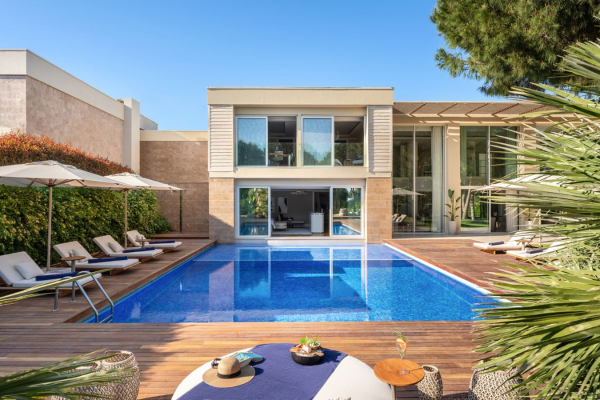 Club Villa (164 м², макс. 5 человек, 4 комнаты, кухня, терраса) — вид на сад и бассейн.