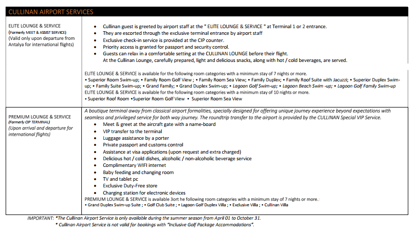 06.10.2025. Для гостей отеля будет доступна услуга Meet & Assist service с 01 апреля по 31 октября 2026 г. В аэропорту Антальи для международных рейсов доступны обновленные услуги Elite Lounge и Premium Lounge независимо от категории номера. Бесплатная услуга предоставляется для гостей: Superior Roof / Golf View / Sea View — при проживании от 10 ночей; для всех остальных категорий номеров — при проживании от 7 ночей. Бронирование гольф-пакета не включено в данную услугу. Подробнее об услуге.