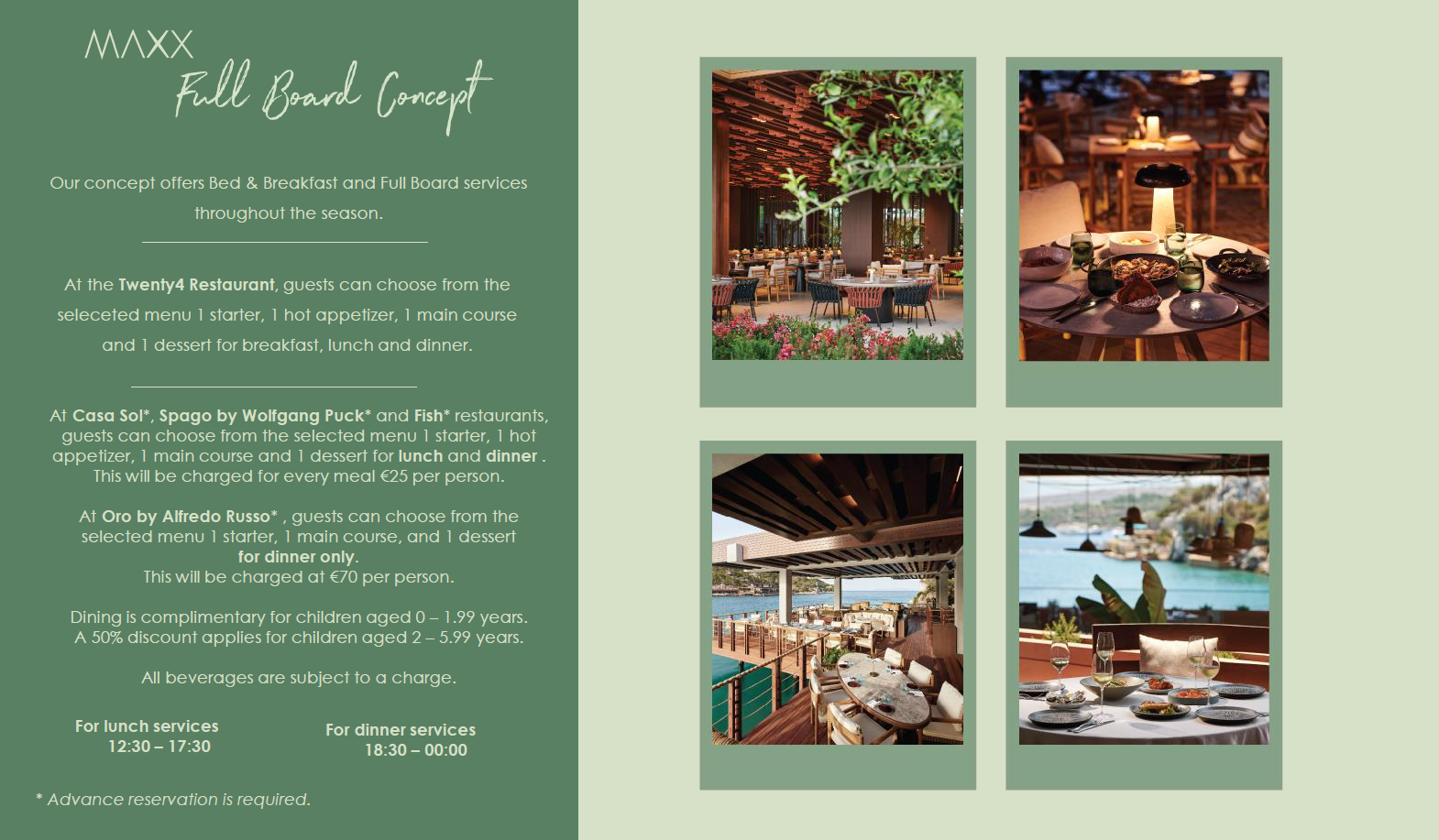 12.05.2025. Концепция Full Board («Полный пансион») обновлена и будет действовать с 13 мая 2025 г. Рестораны: Fish Restaurant, Casa Sol, Spago by Wolfgang Puck — обед и ужин; Oro By Alfredo Russo — ужин ($).