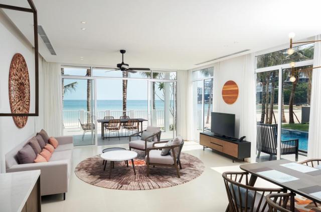 Beachfront Villa 3 bedrooms (350 м2): двухэтажная отдельно стоящая вилла с видом на море; на 1-ом этаже: зона гостиной и кухни, спальня, одна ванная комната с душем и ванной; на 2-ом этаже: две спальни, две ванные комнаты с душем, собственный бассейн, балкон/терраса; максимальное размещение 6 взр. и одно доп. место