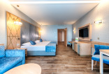 Номера полулюкс (Junior Suite): 1 большая кровать 220 × 200 см, Совмещенная гостиная с диваном. Все номера с видом на море
