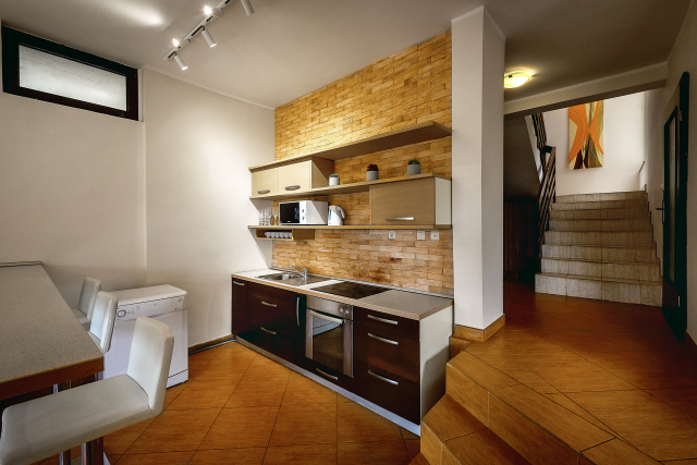 1 этаж – просторная гостиная с диваном раскладывающимся креслом, ТВ плазма, кондиционер; кухня оборудована всем необходимым – холодильник, посудомоечная машина, микроволновая печь, электрический чайник, посуда для готовки; санузел (душ и туалет), спальня с французской кроватью и кондиционером; терраса с лежаками, комплект летней мебели, летняя кухня, где можно приготовить барбекю.