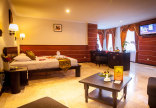 кондиционер, телевизор, спутниковое ТВ, IDD-телефон, сейф, холодильник, ванная комната с ванной и душем, фен, горячая и холодная вода, тапочки, электрический чайник, шкаф, ежедневная уборка номеров, минеральная вода, есть смежные номера (56 кв.м).