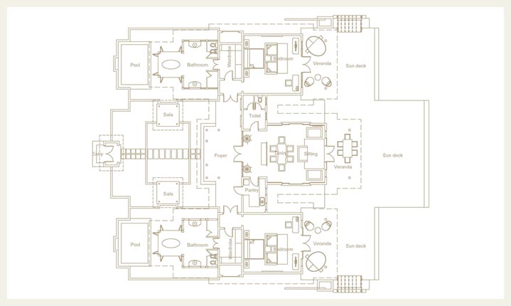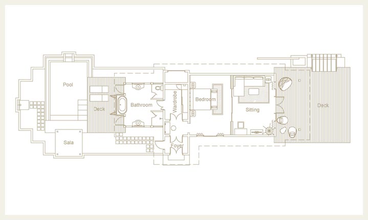 Deluxe Pool Villa (160 м2): 4 виллы – на берегу, 4 – в глубине острова; большая спальня, гостиная и веранда, ведущая к садам у пляжа; в собственном внутреннем дворике виллы находится бассейн и джакузи, окруженные тишиной сада, а также увенчанный тростниковой крышей павильон с ложей для отдыха и террасой для загара; кофемашина Nespresso, DVD плеер, завтрак в ресторане Thila; Максимальное размещение - 2 взрослых и 2 детей или 3 взрослых (схема номера)