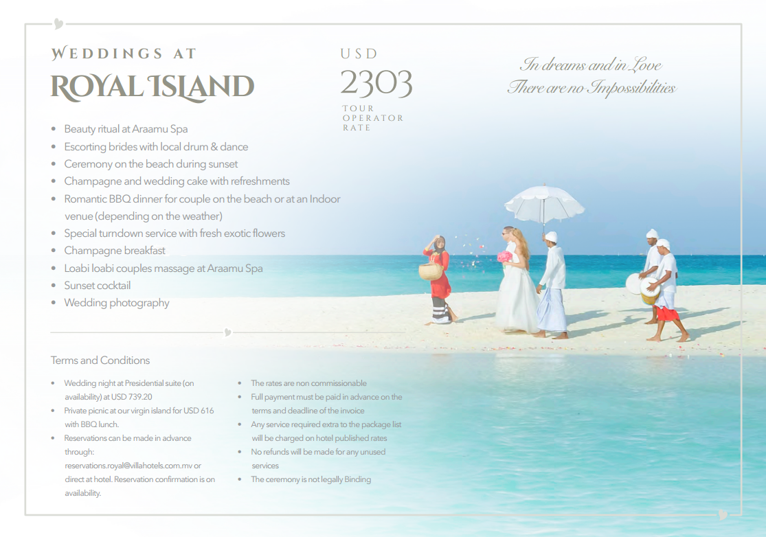 Условия предоставления услуги: копия свидетельства о заключении брака присылается при бронировании в ICS Group, оригинал свидетельства предоставляется в отеле (для молодоженов необходимо предоставить свидетельство о браке не более 12 месяцев; для годовщины свадьбы — дата регистрации должна совпадать с датами проживания).