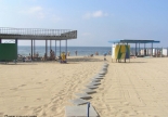 собственный благоустроенный (теневые навесы, топчаны, 2 медицинских павильона, навесы рассеянной радиации, питьевые фонтаны, ногомойка) с мелким "золотистым" песком. Общая площадь пляжа 1,7 га