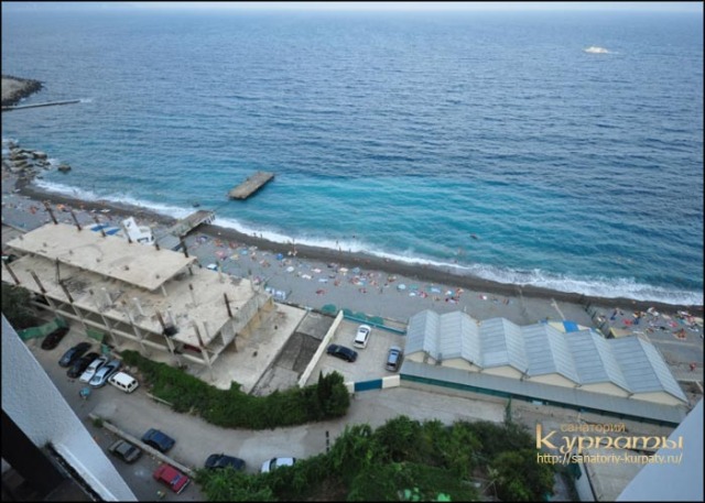 Пляж: 50 м от корпуса Дружба и дальше спуск на лифте прямо на пляж. От корпуса Пальмира Тольятти 300 м. Пляж: Собственный, мелко-галечный, оборудован душевыми кабинками, теневыми навесами и медицинским пунктом. Доступ к пляжу осуществляется с помощью лифта
